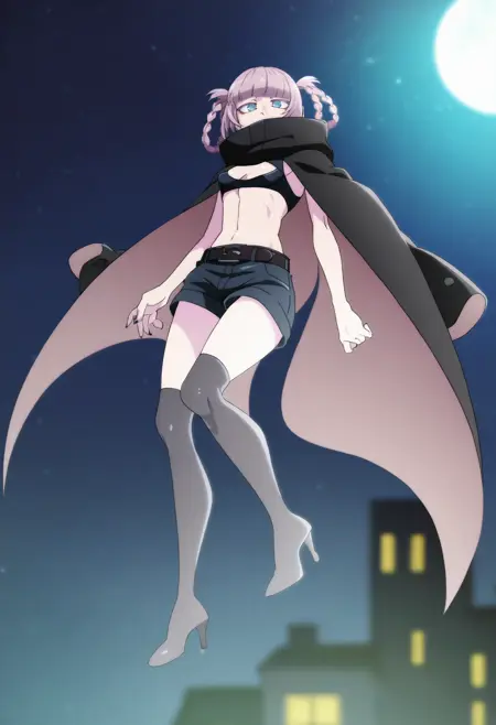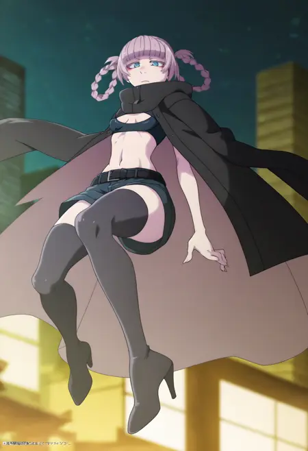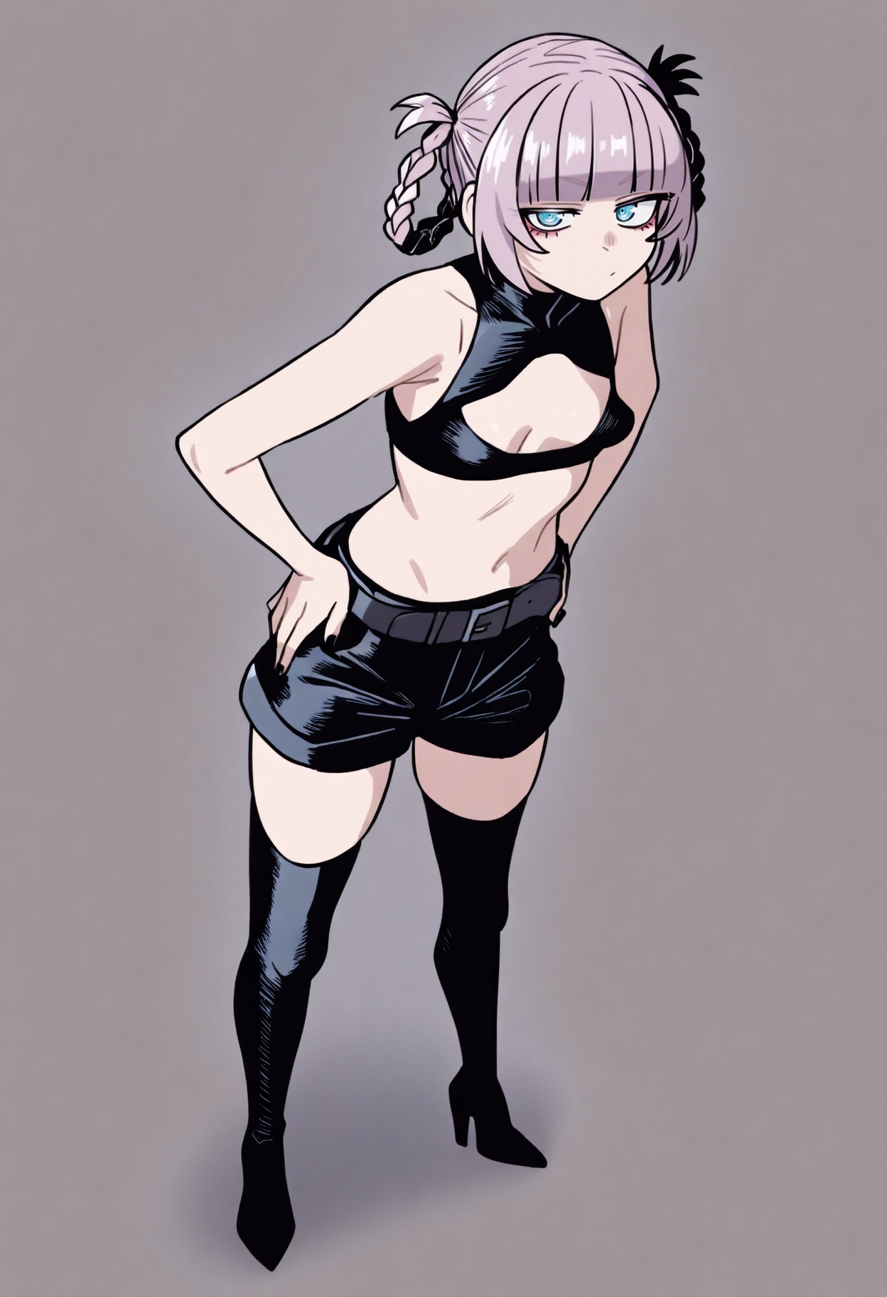 服装提示词:belt, black shorts, cleavage cutout, sleeveless turtleneck, crop top, thighhighs, black thigh boots, high heel boots