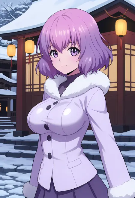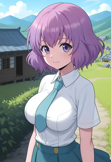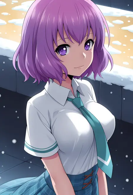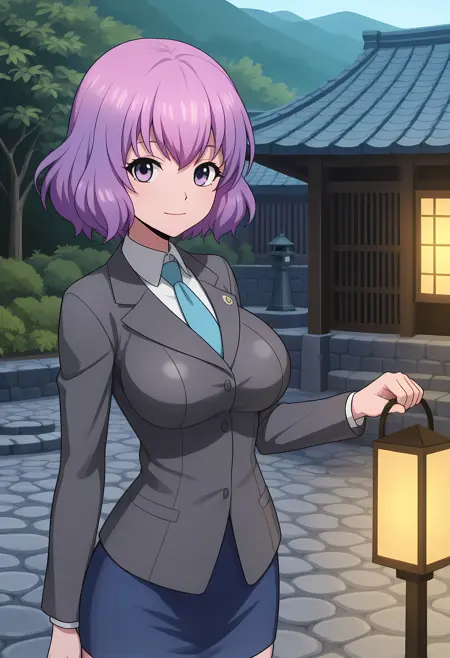 Appearance → ohwx, short_hair, purple_hair, purple_eyes, 1girl, breasts, large_breasts, medium_breasts, pink_hair,