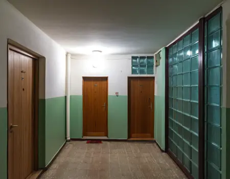 폴란드/동유럽 콘크리트 아파트 내부 - 복도, 계단, 오래된 출입문, 70년대, 80년대, 90년대 분위기