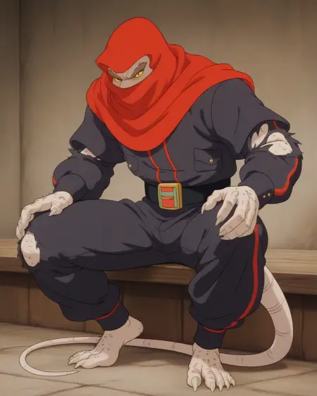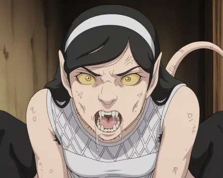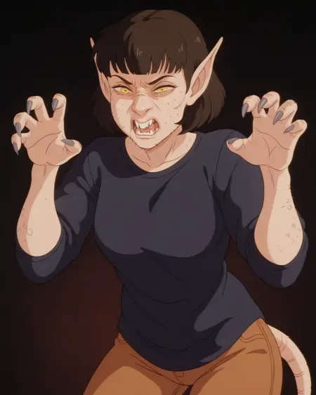 _ratrot, stalking hunched over, rr_nose, rr_teeth, rr_pointed_ears, rat tail, bad skin, hairy, warty, legs apart, knees bent, (no humans), transformation, mind controlled