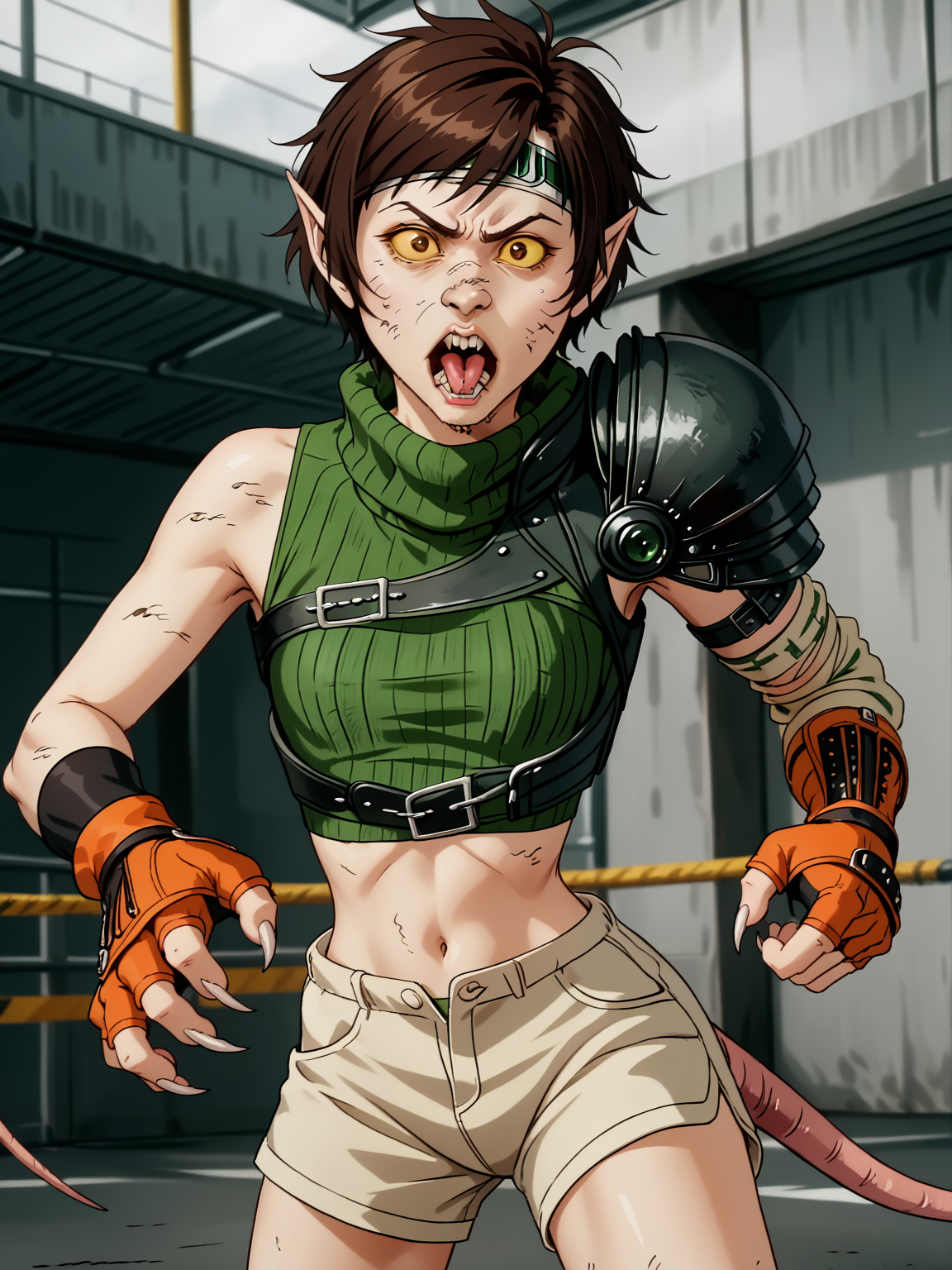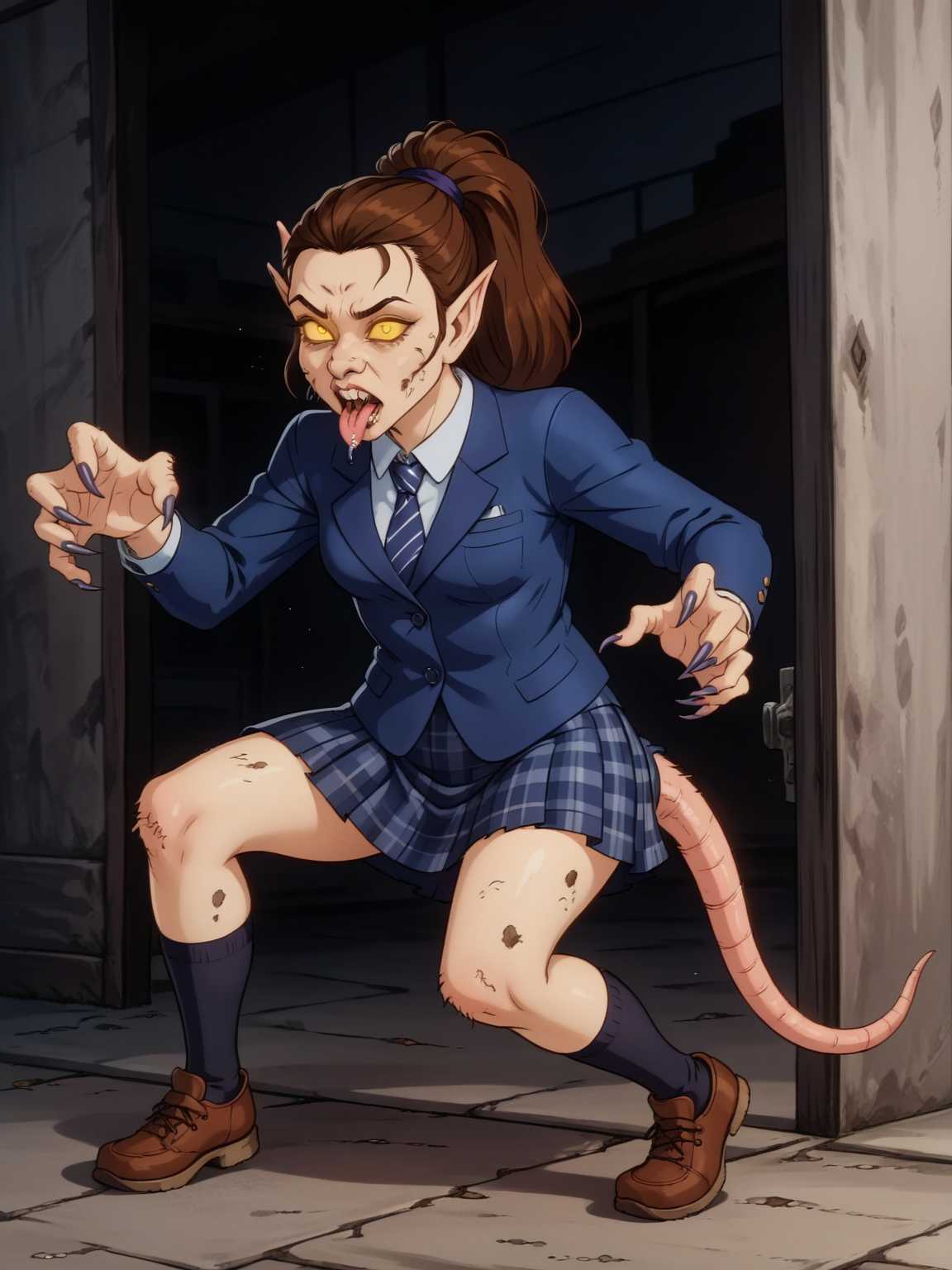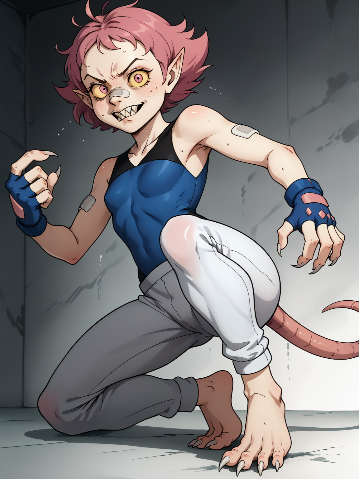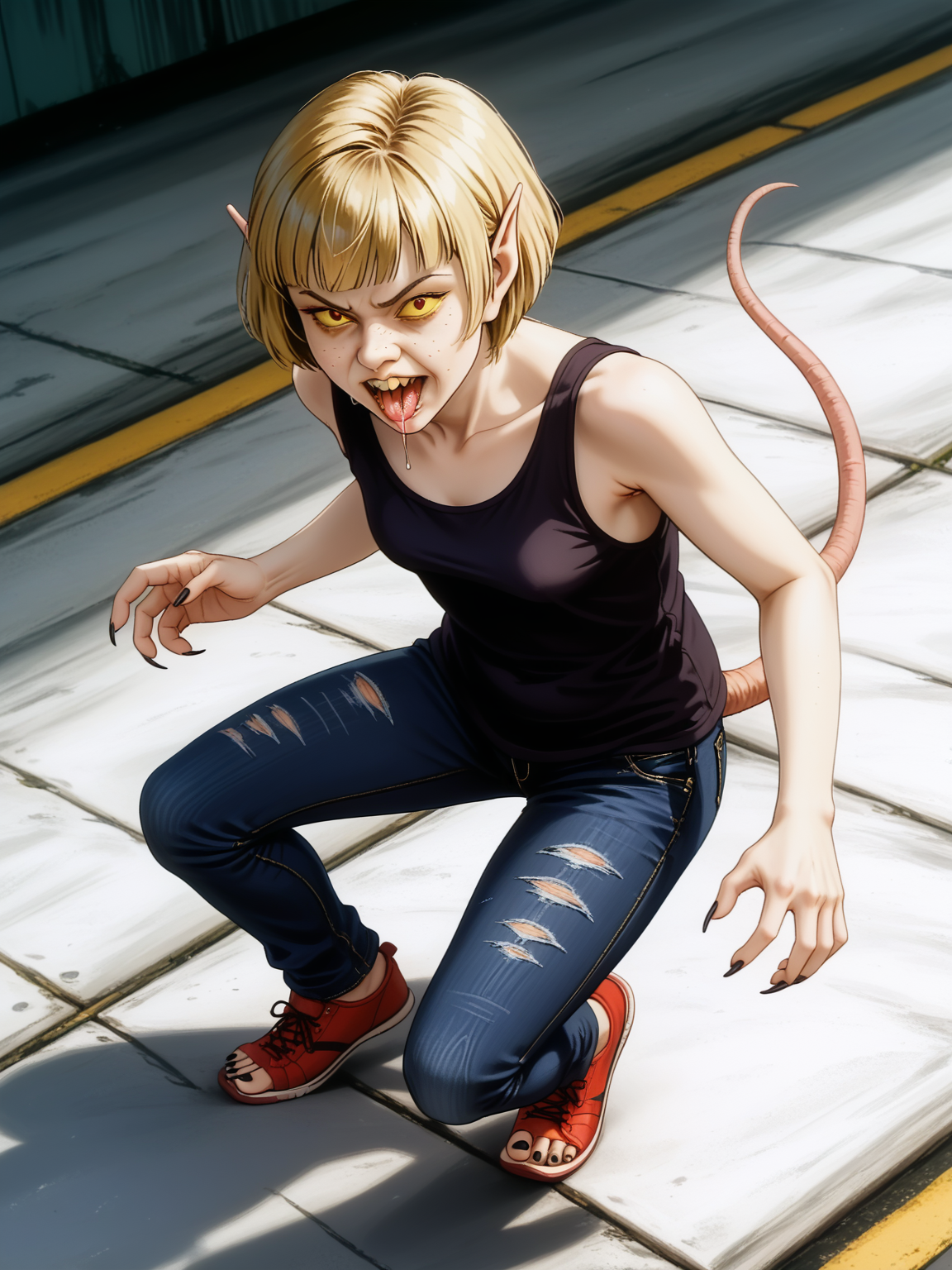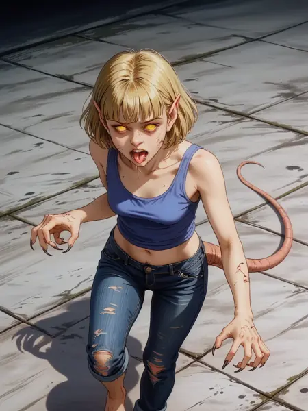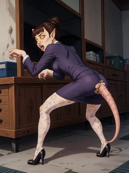 ratrot, 스톨링하며 휘어진 자세, rr_nose, rr_teeth, rr_pointed_ears, 쥐 꼬리, 나쁜 피부, 털많음, 두꺼비살, 다리 벌림, 무릎 구부림, (인간 없음), 변신, 마인드 컨트롤