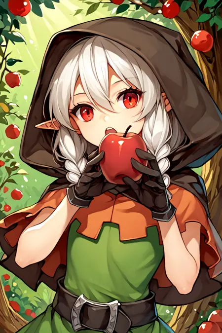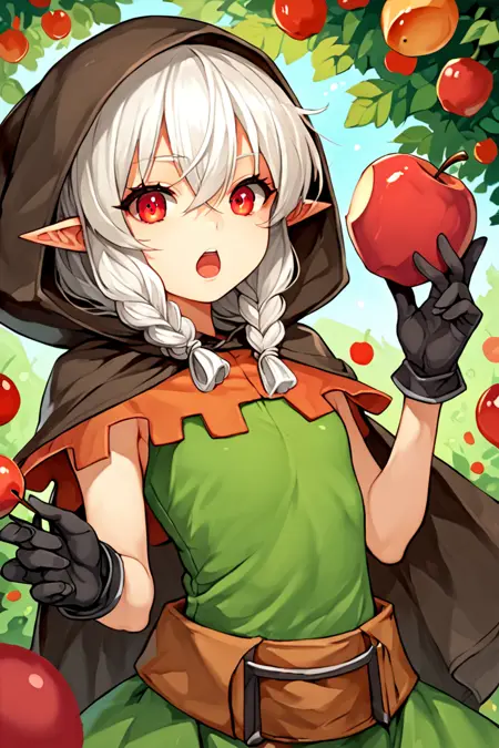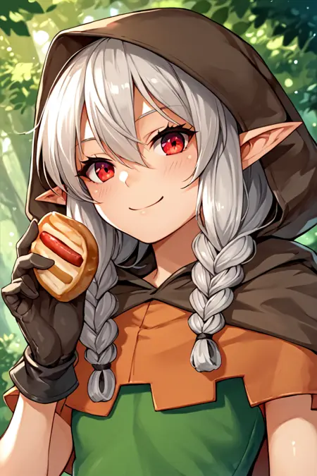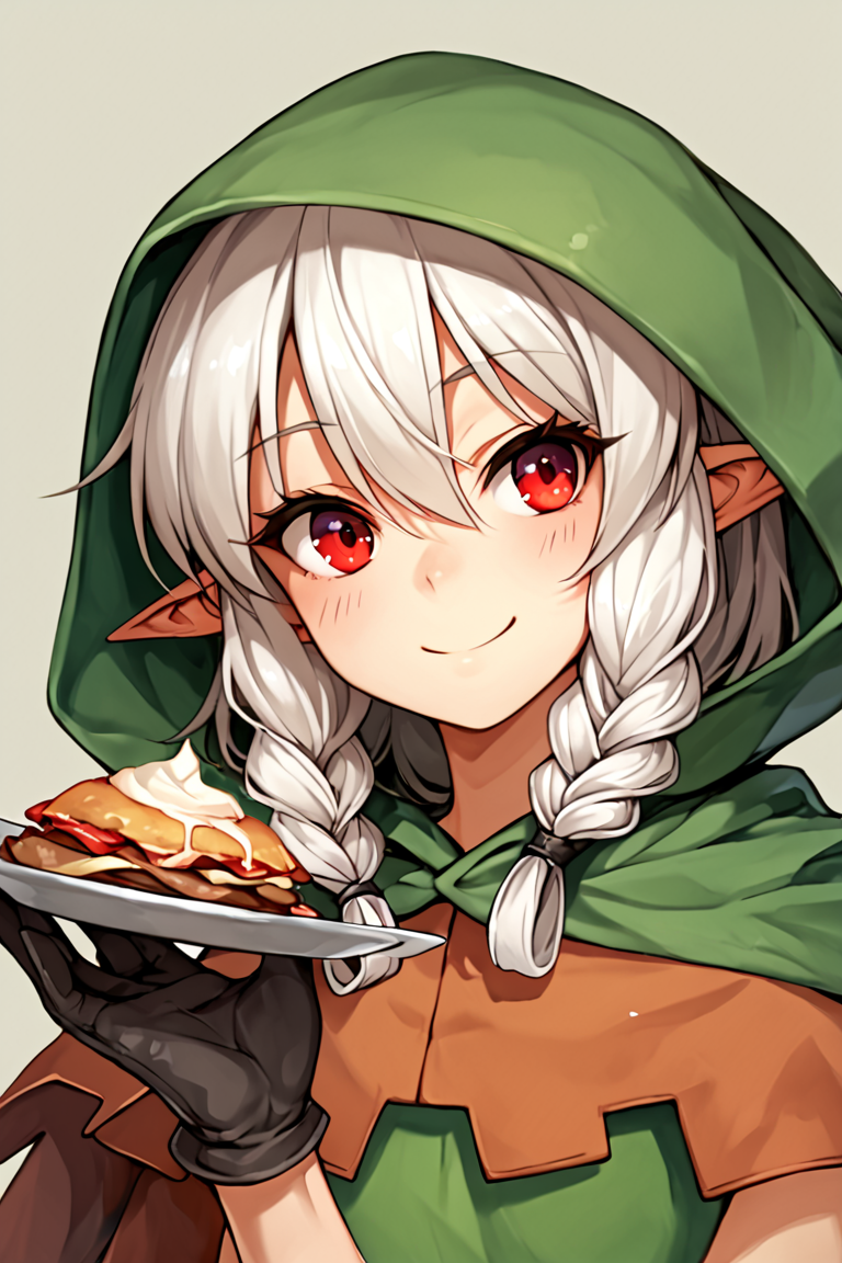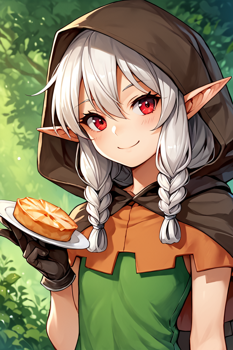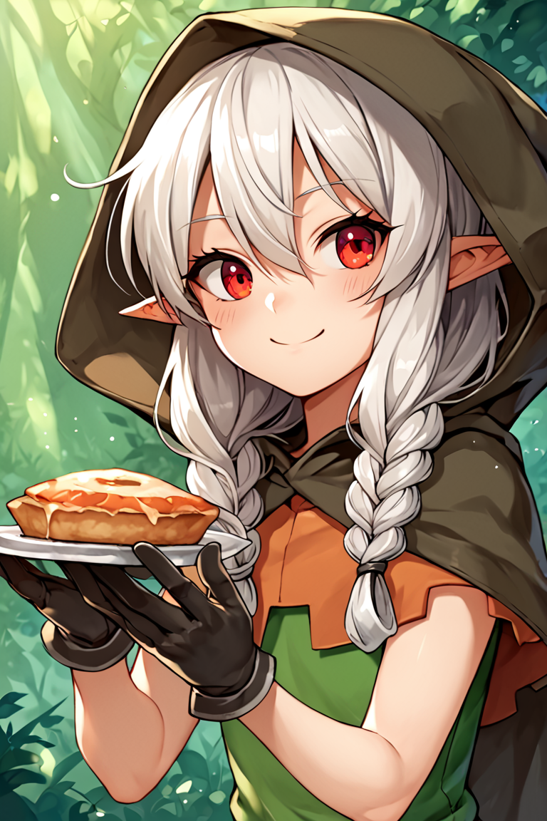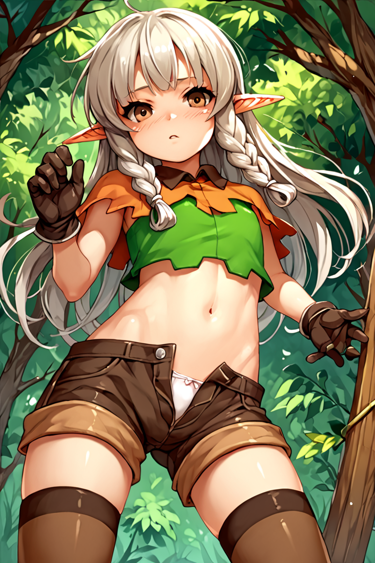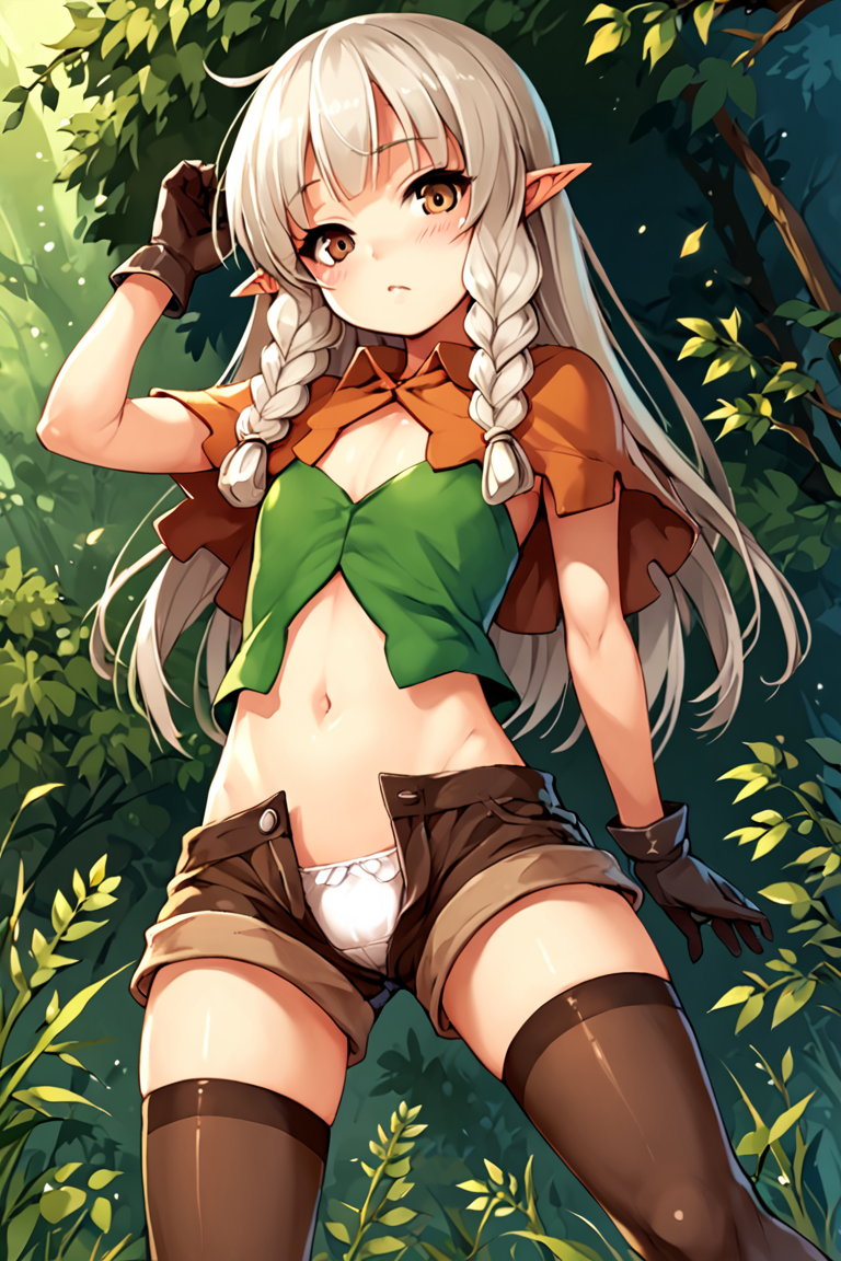 精灵,1个女孩,大腿长靴,单人,过膝袜,靴子,手套,双马尾,武器,棕色眼睛,兜帽,短裤,尖耳朵,马尾,弓(武器),箭(投射物),斗篷,小乳房,白发,箭袋,
