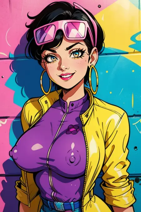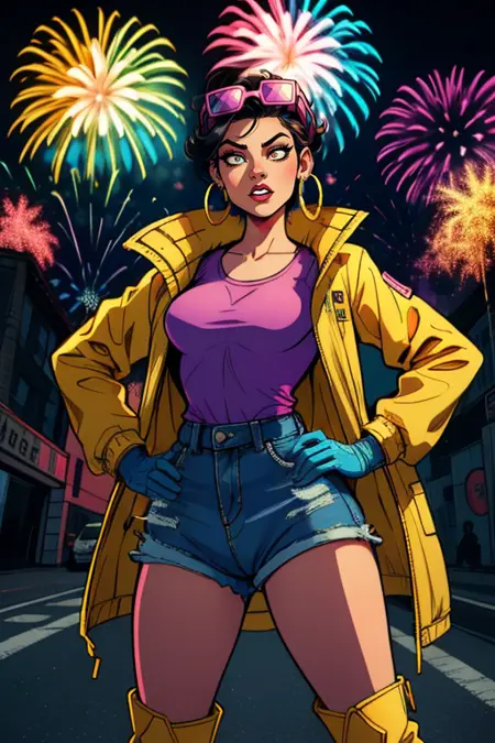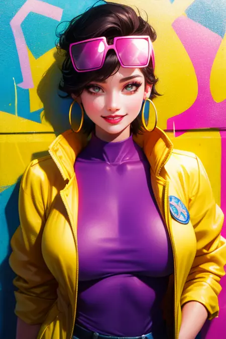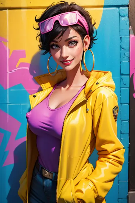 jubJak, denim shorts , open yellow jacket, purple shades on head, hoop earrings ,blue gloves, pink shirt, blue boots,