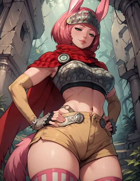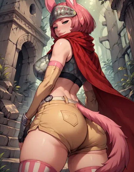 red scarf, cape, fingerless gloves, elbow gloves, shorts, long tail, mismatched legwear, crop top,