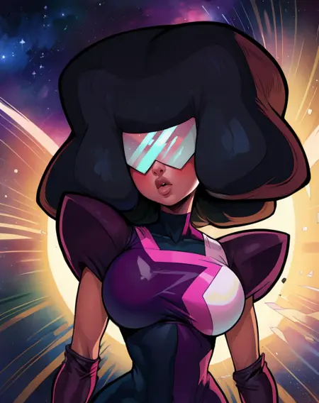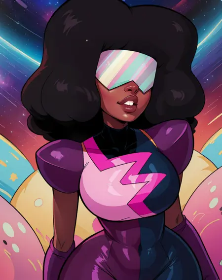 Garnet, 검은 머리카락, 입술, 레트로 색안경 또는 레트로 선글라스 또는 큰 네온 색안경