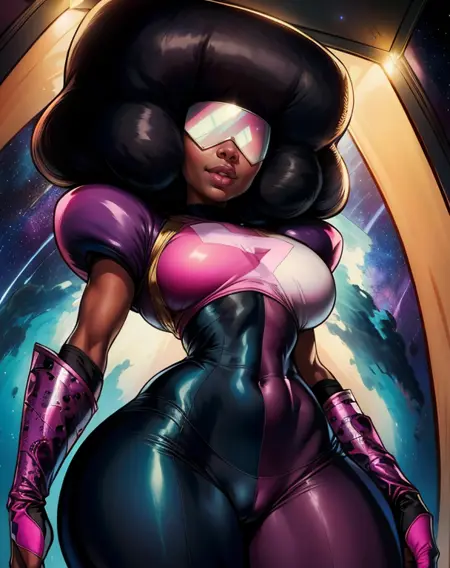 짧은 가슴 보호대, 검정과 분홍색 바디수트, 팔꿈치 장갑, 둥근 어깨 패드