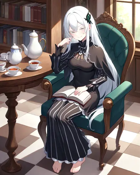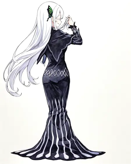 appearance: Echidona, white hair, black eyes, hair between eyes, long hair, butterfly hair ornament