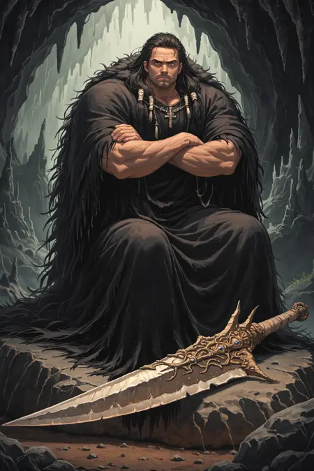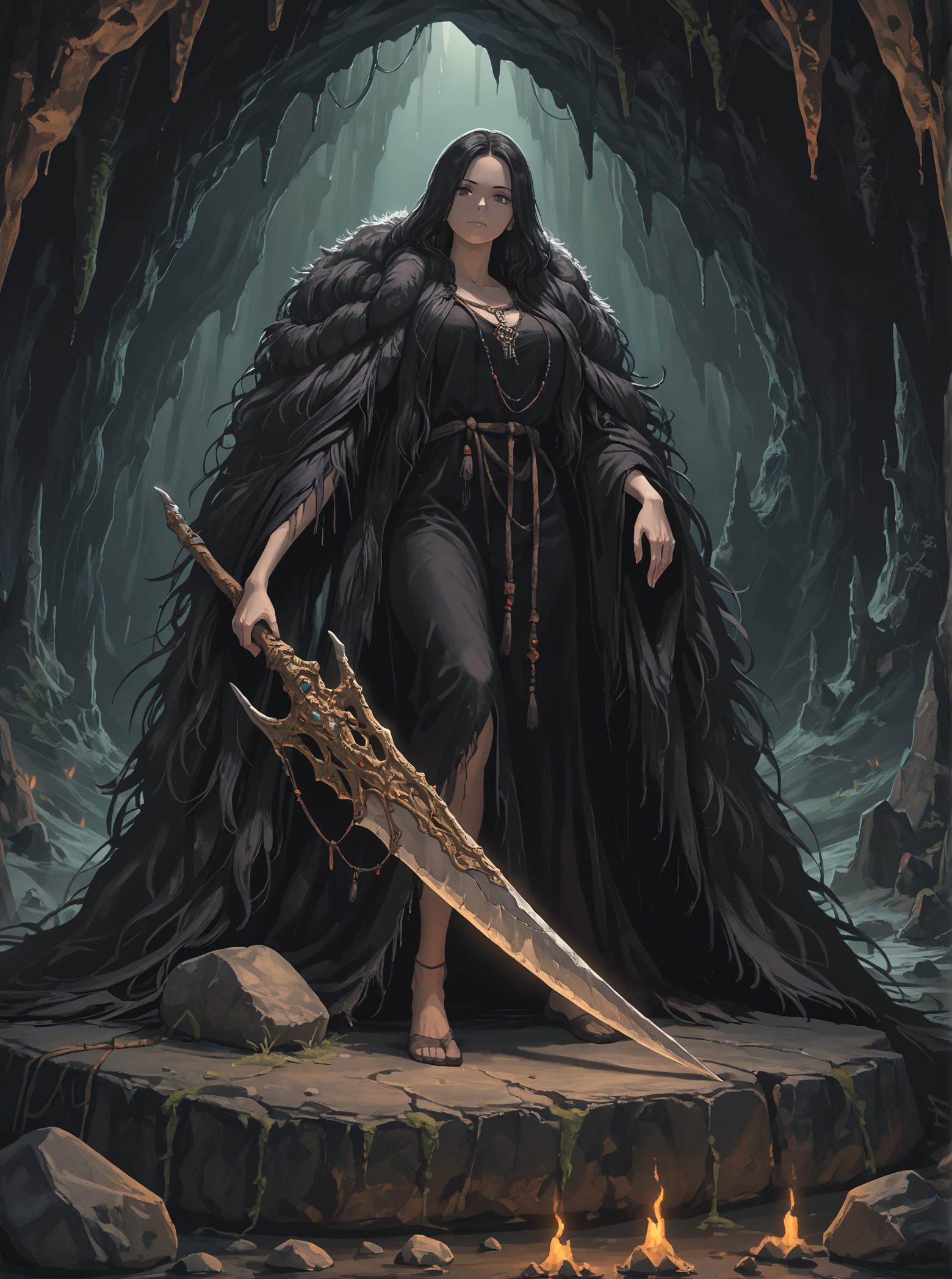 可选词:毛皮镶边,巨大武器,巨剑,手持火焰,破烂衣物,巨人,体型差异