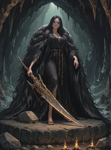 옵션: 털장식, 거대한 무기, 그레이트소드, 불을 들고 있는, 찢어진 옷, 거인, 크기 차이