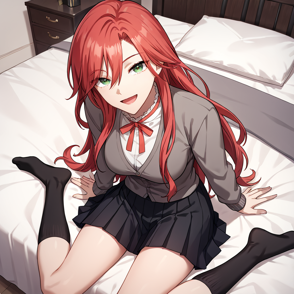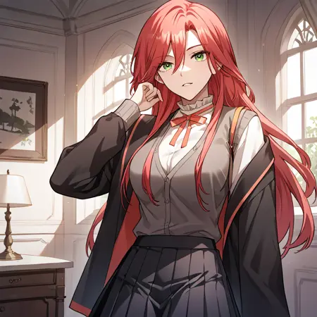 リボン, 首リボン, 黒いローブ, 白いシャツ, フリルの襟, スクールユニフォーム, グレーのカーディガン, 黒いスカート, 太もも, 黒い靴下, 黒い靴,