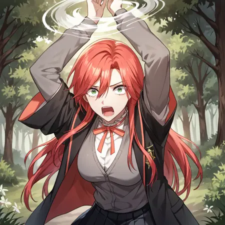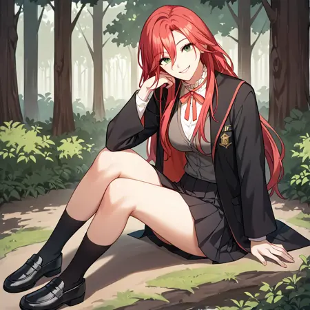 리본, 목 리본, 검정 로브, 흰색 셔츠, 주름진 칼라, 학교 유니폼, 회색 카디건, 검정 치마, 허벅지, 검정 양말, 검정 신발,