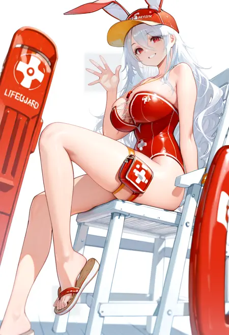 Rabbit on Watch (Swimsuit): phlg, baseball cap, fake animal ears, flip-flops, strapless one-piece swimsuit, thigh pouch, toenails, whistle around neck, red swimsuit,