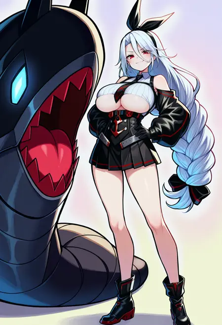 Base outfit: phog, ribbed shirt, sleeveless shirt, underboob, low-braided long hair, bare shoulders, black necktie, hair ribbon, ankle boots, high-waist skirt, red trim, black jacket, white shirt
