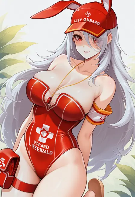 Rabbit on Watch (Swimsuit): phlg, baseball cap, fake animal ears, flip-flops, strapless one-piece swimsuit, thigh pouch, toenails, whistle around neck, red swimsuit,