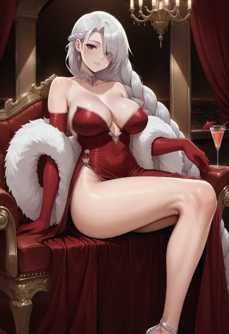 On Stage (Party Dress): phjr, bare shoulders, braid, elbow gloves, evening gown, feather boa, high heels, long dress, red dress, side slit, strapless dress, mole under eye, long hair, red eyes, hair ribbon, animal ears