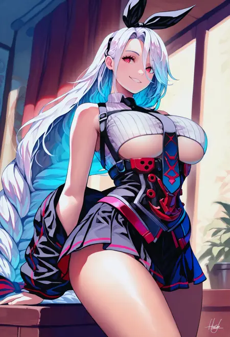 Base outfit: phog, ribbed shirt, sleeveless shirt, underboob, low-braided long hair, bare shoulders, black necktie, hair ribbon, ankle boots, high-waist skirt, red trim, black jacket, white shirt