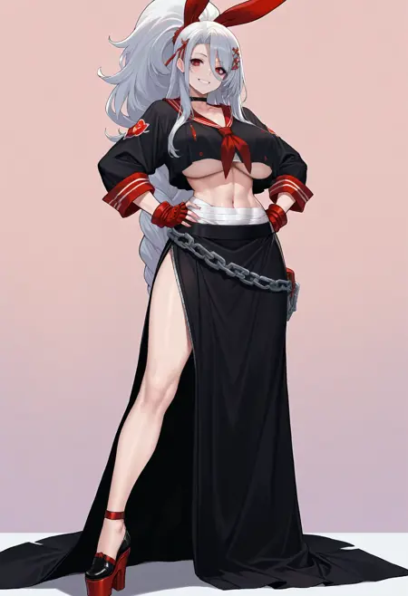Secret Boss o' the Underworld? (Delinquent): phsuke, bare legs, black serafuku, crop top overhang, fingerless gloves, high ponytail, midriff, platform heels, red gloves, fingerless gloves, sailor collar, no bra, x hair ornament, sarashi, long skirt