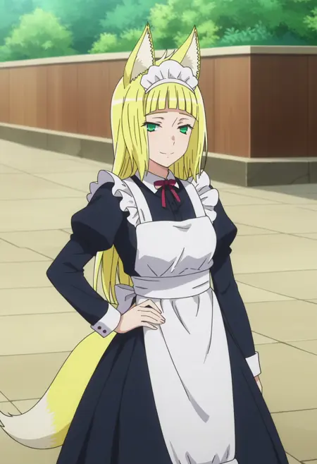 shiharuhimemaid, fox ears, fox tail, long hair, blonde hair, green eyes, blunt bangs, maid headdress, maid apron, black dress, puffy sleeves, neck ribbon,