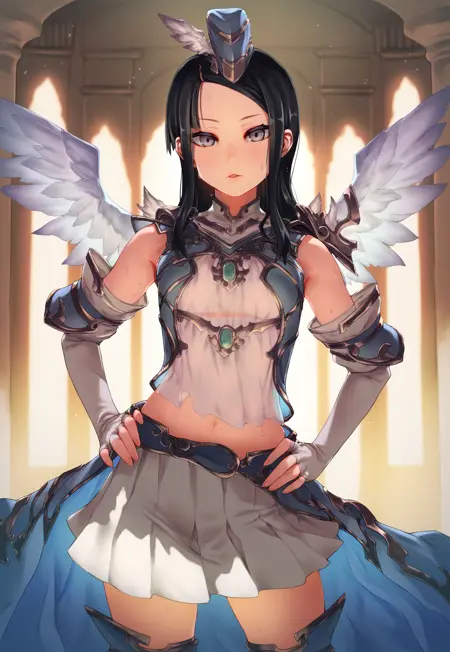 purple eyes, [[glowing feathered wings]], waist cape, faulds, showgirl skirt, hat, parted bangs, long hair, black hair, grey eyes, skirt, white skirt, transparent, see-through, midriff, thighhighs, gloves, detached sleeves, armor, petite, small breasts,
