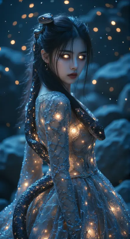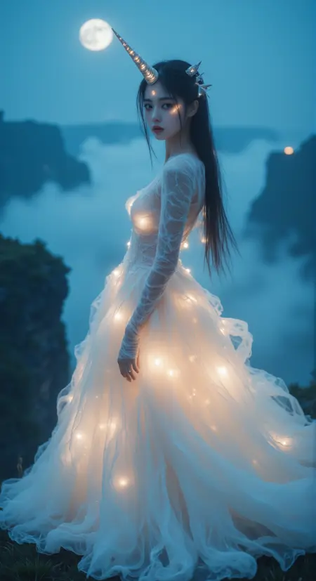 A photo of a young Asian woman as a moonlit raven sorceress, dressed in flowing black feathers that shimmer in the dim light, with piercing, reflective eyes and a crown of dark gems. She stands on a castle balcony under a crescent moon, overlooking a foggy valley. Shot with an 85mm lens, the cool silver and deep blue lighting adds a mysterious glow to her dark, regal attire.
