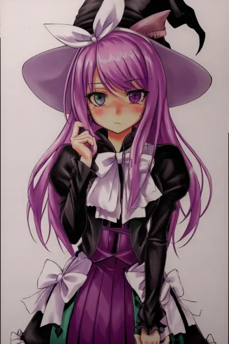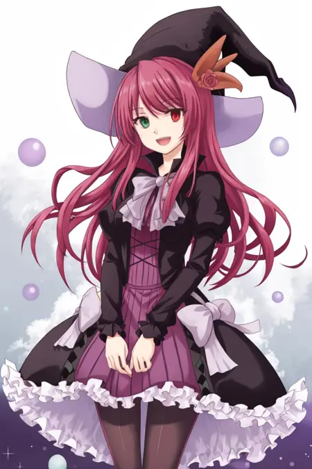 Prompt: majoleine, hat, dress, bow, ribbon, pantyhose, sidelocks, witch hat.