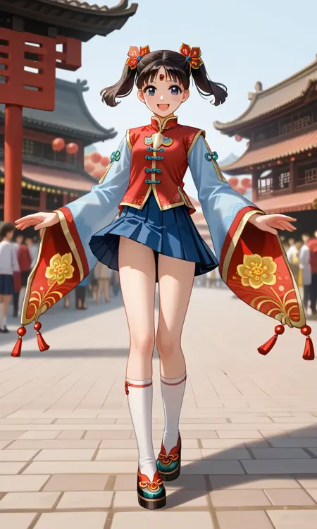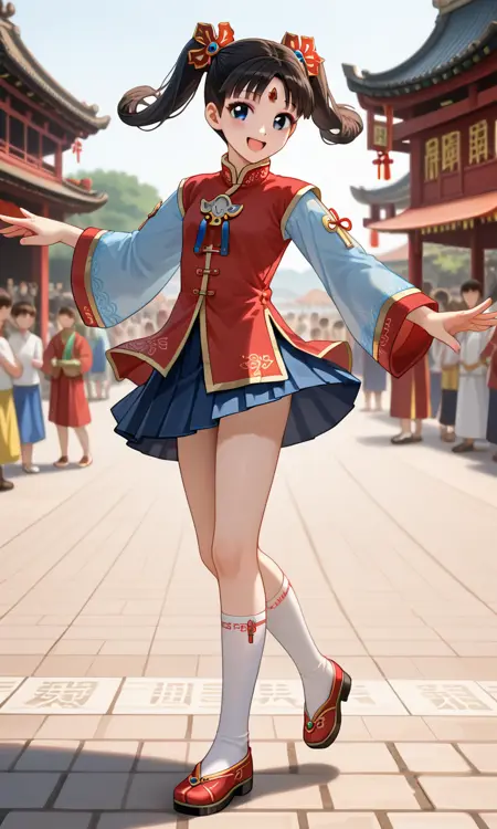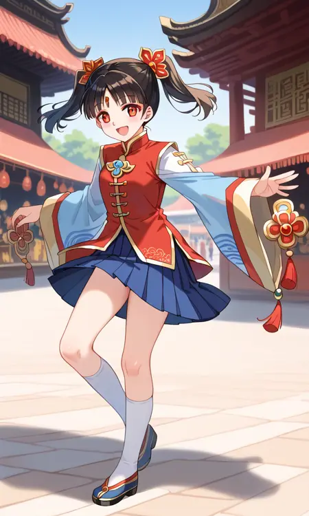 Da Qiao, short black hair, twintails, hair above ears, hair ornaments, chinese clothes, red top, pale blue sleeves, blue short skirt, pleated skirt, white kneehigh socks