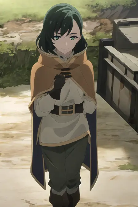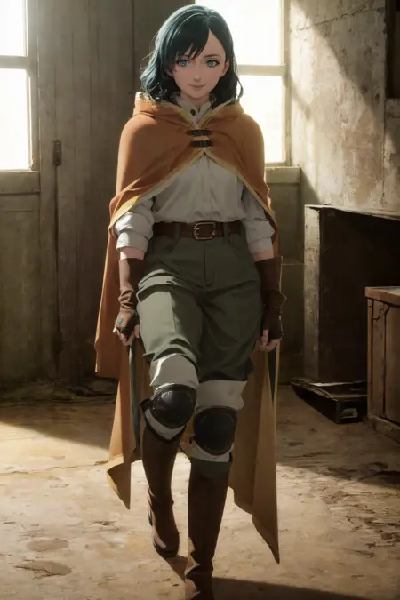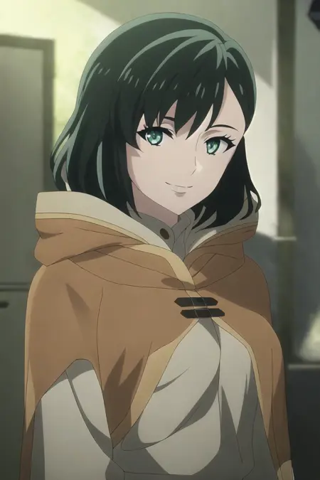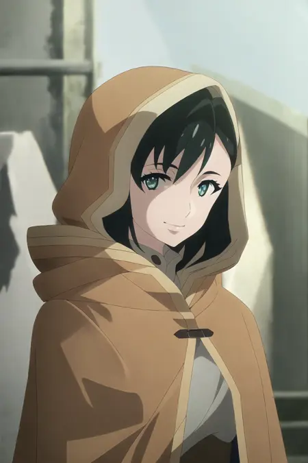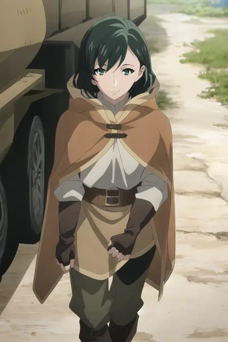 green eyes, black hair, green hair, cape, cloak, hood up, fingerless gloves, knee pads, brown gloves, weapon, rifle, kalashnikov rifle, ak-47