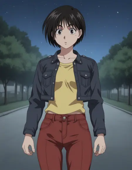 black jakcet, short jacket, open jacket, yellow shirt, red pants