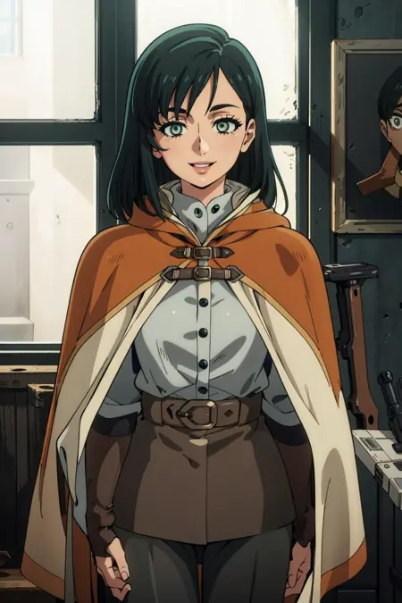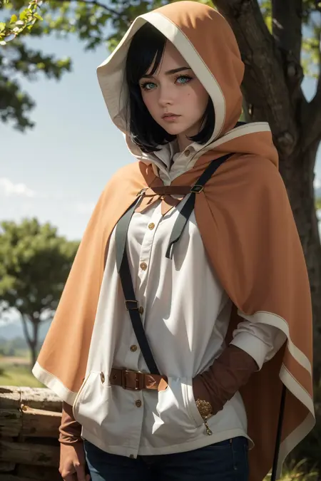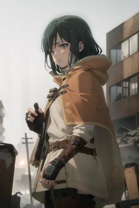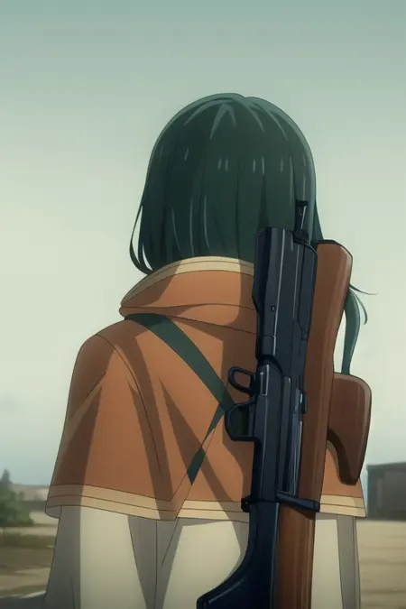 green eyes, black hair, green hair, cape, cloak, hood up, fingerless gloves, knee pads, brown gloves, weapon, rifle, kalashnikov rifle, ak-47