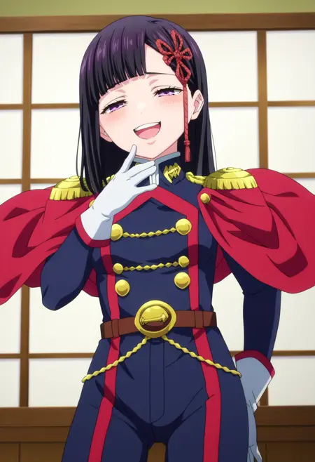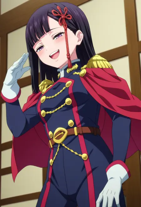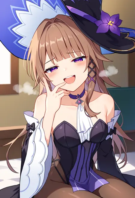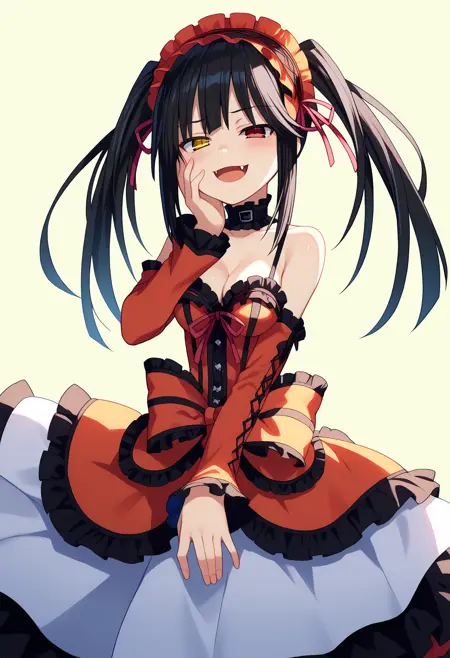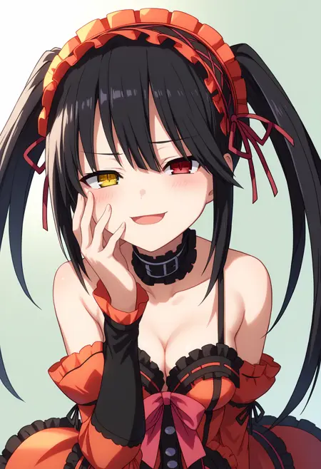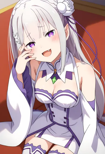张开嘴,微笑, 脸红, 看着观众, 半闭眼睛, 獠牙, 手举起, 手放在自己脸上,