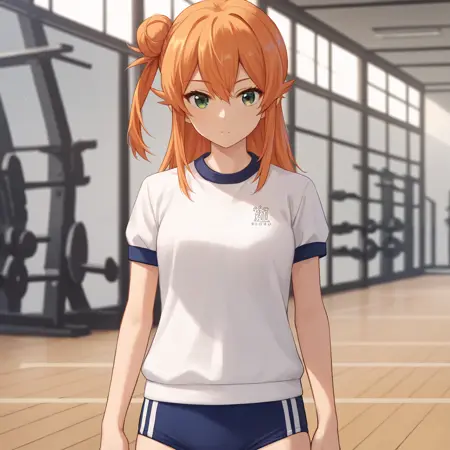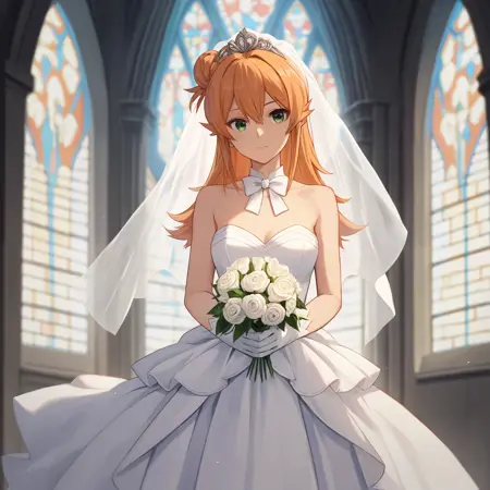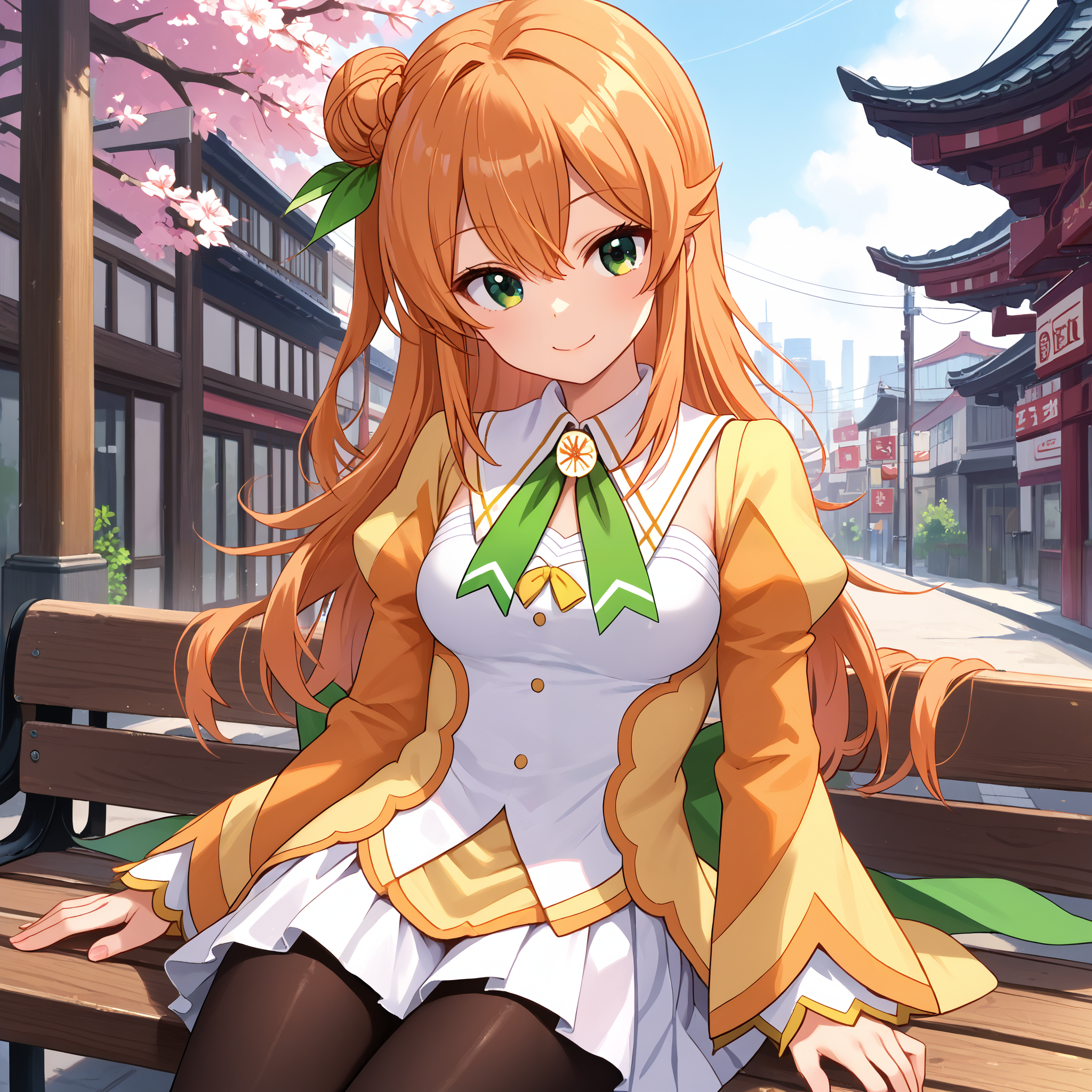 Magical Girl Uniform : hinatsuki mikan, single hair bun, long hair, orange hair, green eyes, magical girl, leaf hair ornament, long sleeves, neck ribbon, yellow dress, green bow, juliet sleeves, white skirt, waist cape, miniskirt, black pantyhose,