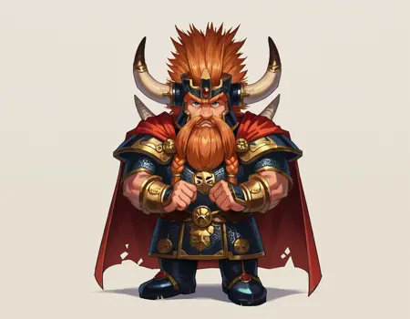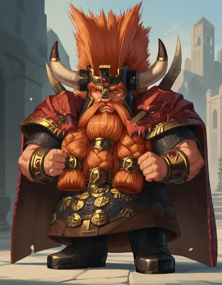 UngrimIronfist, beard, horned helmet, armor, cape,