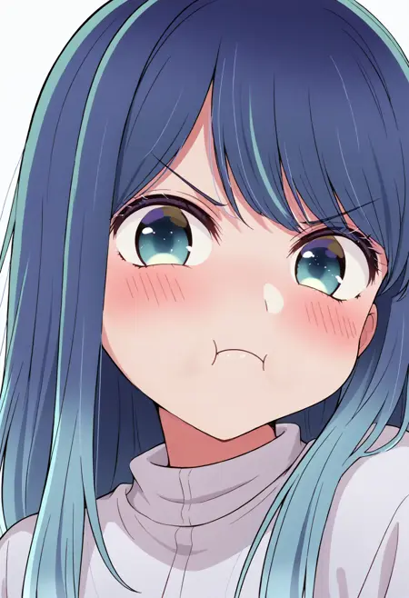 akanepupu, pout, v-shaped eyebrows, (puffy cheeks:0.5)
