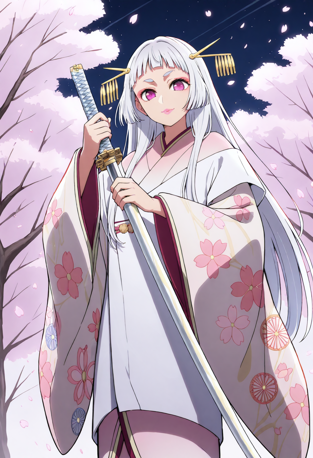 sayahime, very long hair, hime cut, hair ornament, purple eyes, white hair, short eyebrows, blunt bangs, eyeshadow, pink lips