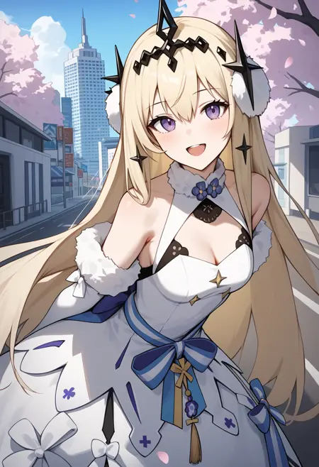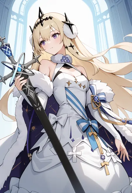 outfit1aabeth, long hair, blonde hair, hair ornament, purple eyes, breasts, fur trim, fur-trimmed cape, bare shoulders, white dress, sleeveless, detached sleeves, bow