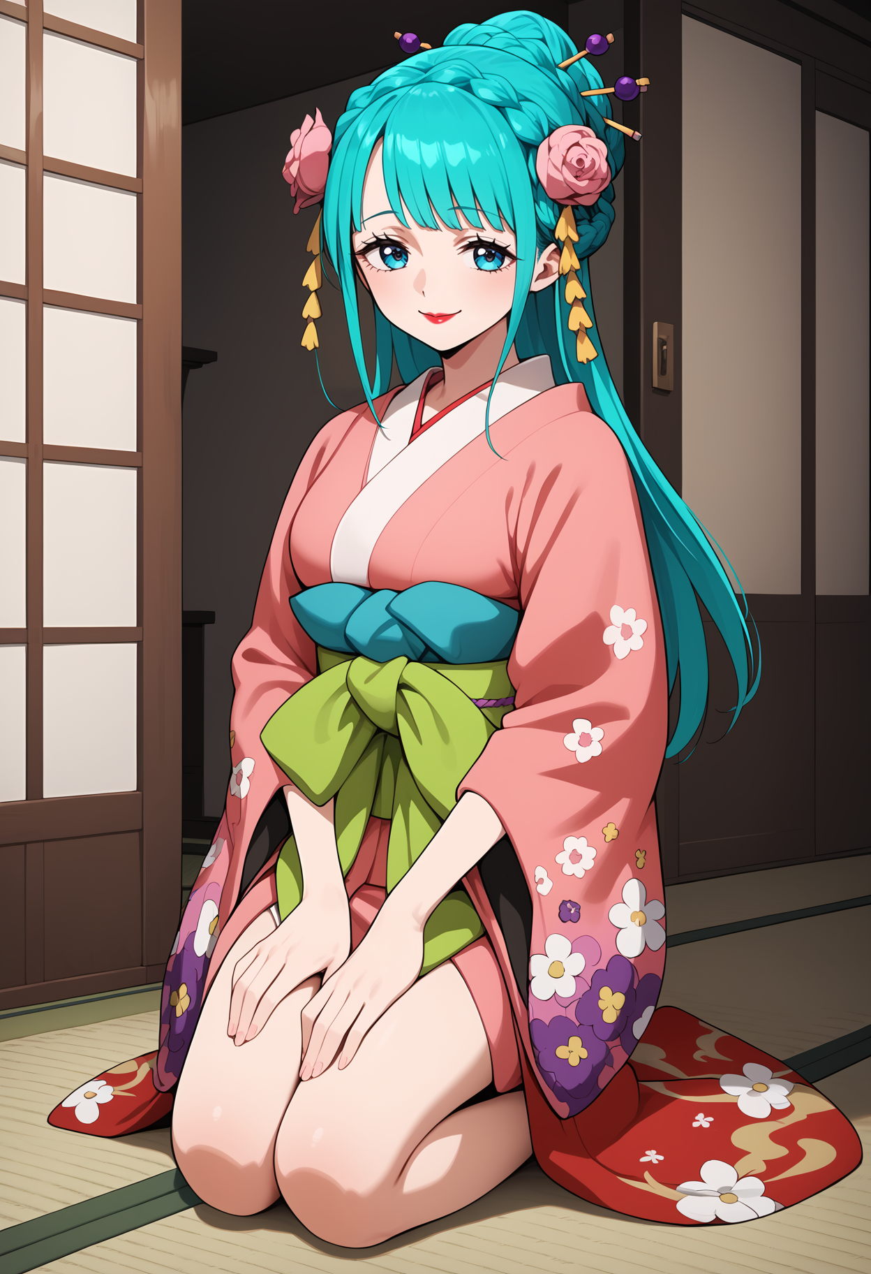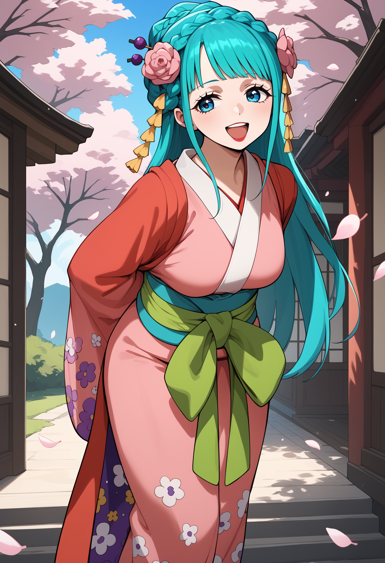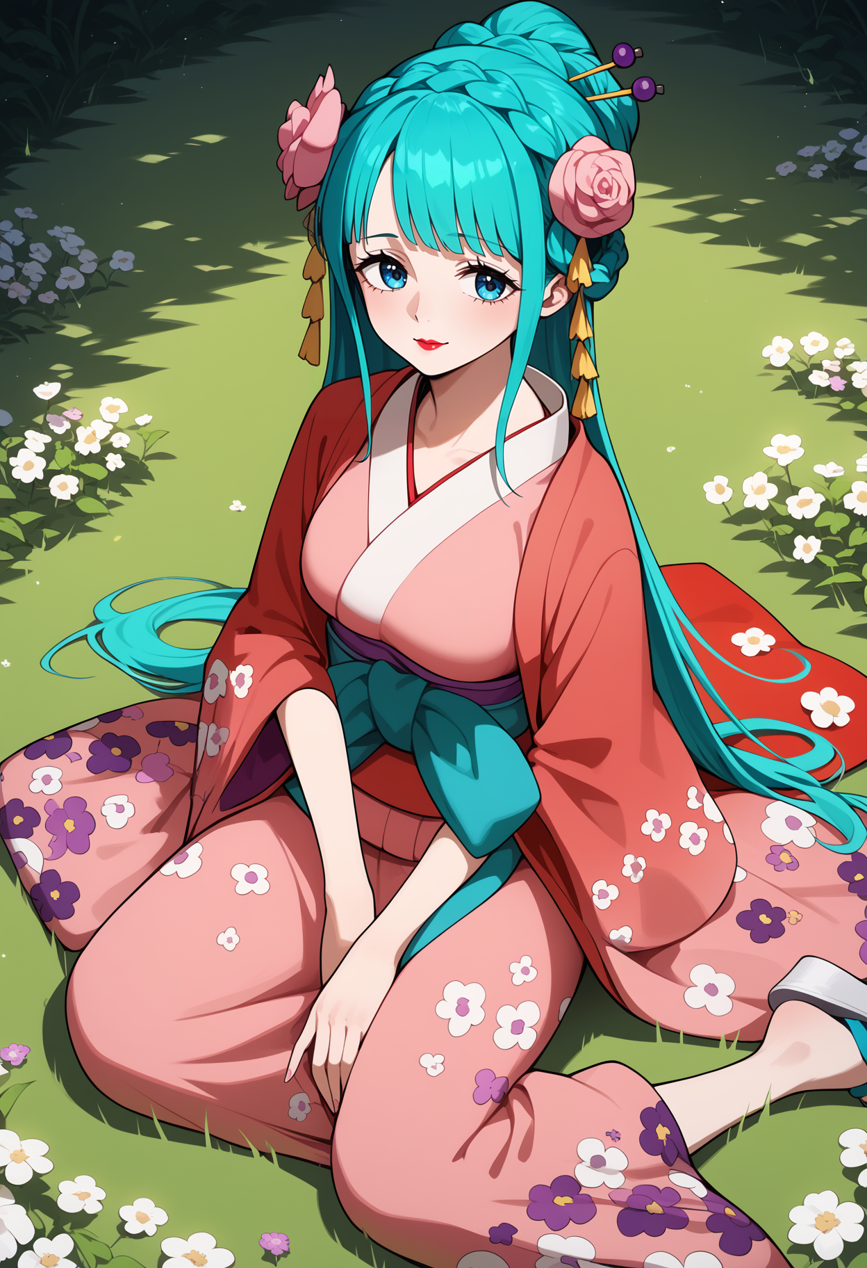 outfit1aahiyori, long hair, aqua hair, braid, hair flower, blue eyes, lipstick, breasts, pink kimono, sash
