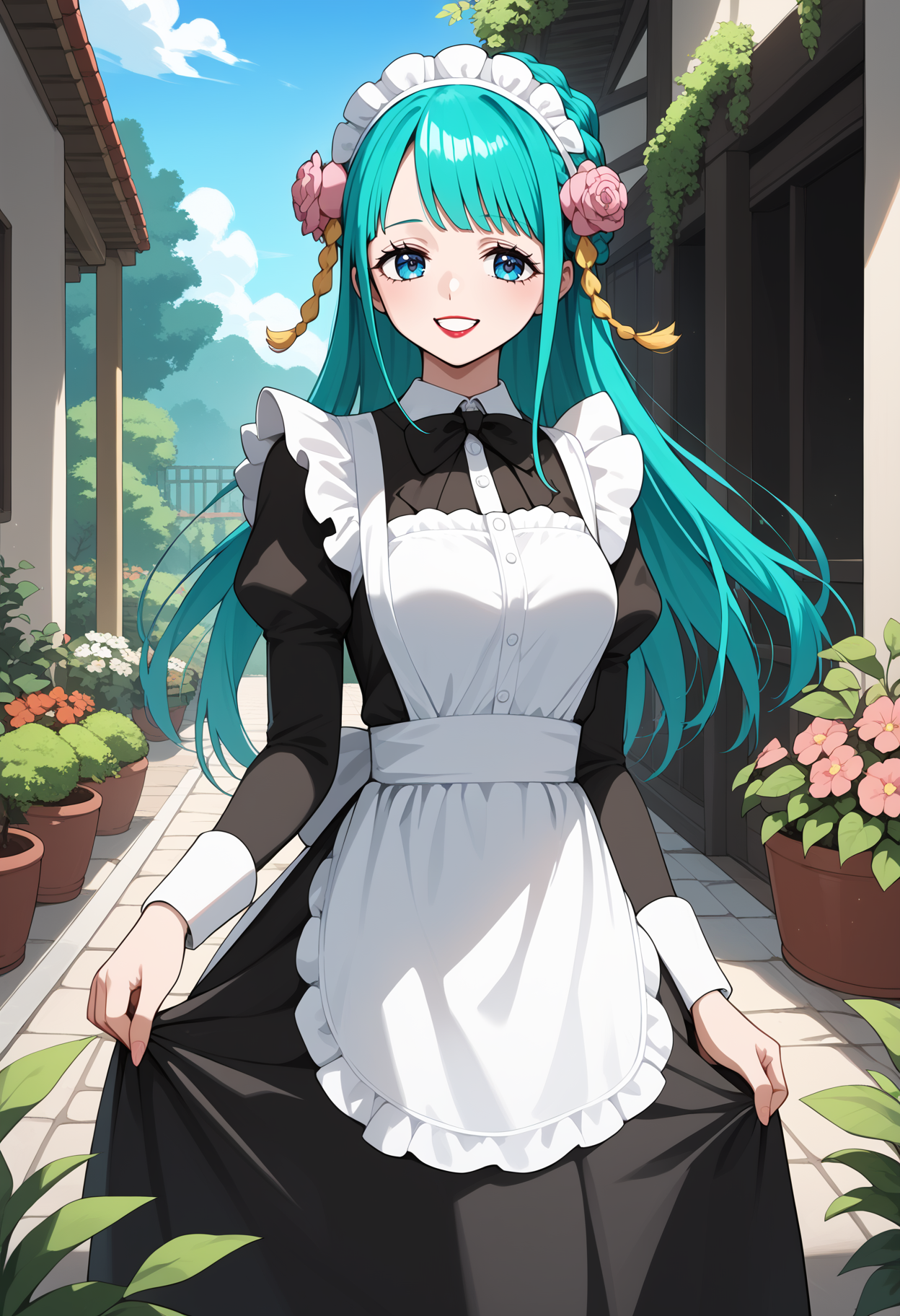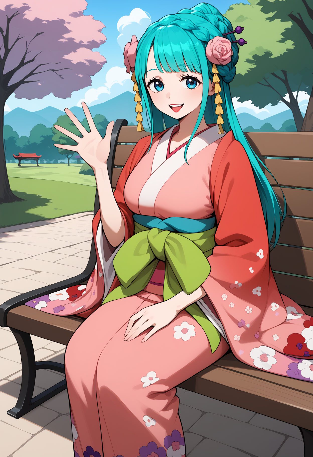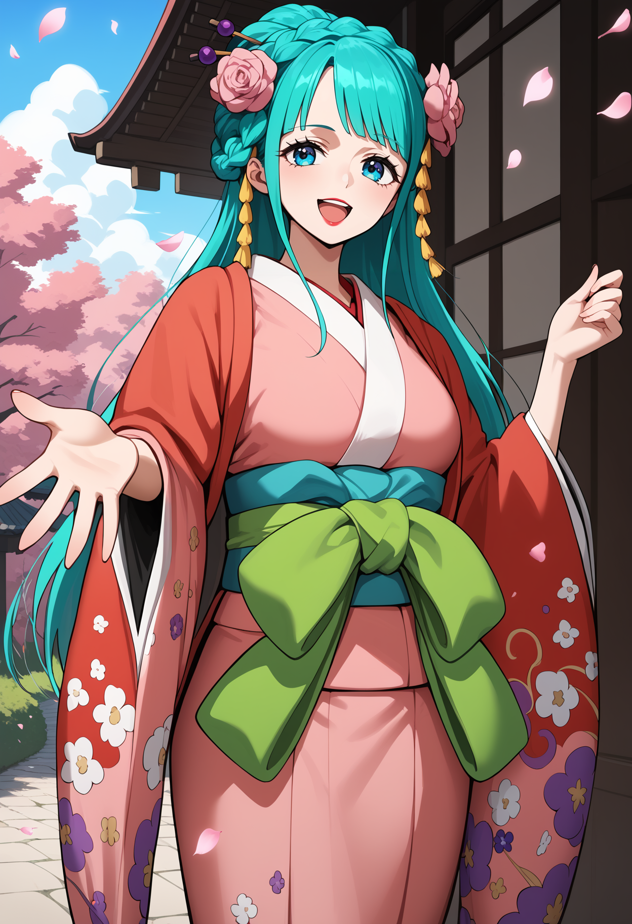 outfit1aahiyori, long hair, aqua hair, braid, hair flower, blue eyes, lipstick, breasts, pink kimono, sash