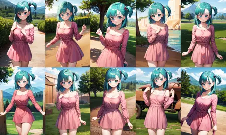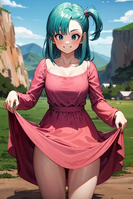 아웃핏2(한쪽 올린 머리)dragon ball, blmsdup, bulma, aqua hair, one side up, pink dress, long sleeves, collarbone, medium breasts