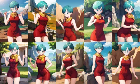 아웃핏5(очень короткие волосы)dragon ball, blmshort, aqua hair, very short hair, earrings, jewelry, red dress, medium breasts, yellow scarf, short dress, sleeveless