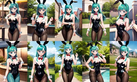 아웃핏3(버니 수트)dragon ball, blmlong, aqua hair, blunt bangs, long hair, playboy bunny, rabbit ears, black pantyhose, red bowtie, wrist cuffs, black leotard, large breasts