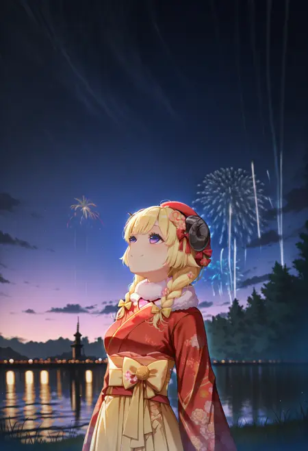 WtmNewYears, horns, blonde hair, purple eyes, twin braids, hair flower, red kimono, yellow hakama skirt, bow, floral print, sash, fur scarf, red beret