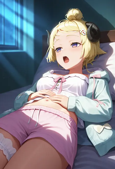 WtmSleep, horns, blonde hair, purple eyes, hair bun, flower hairpin, blue jacket, hooded jacket, white camisole, pink shorts, thigh strap