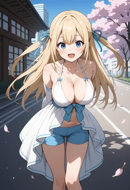 outfit1aasylphy, long hair, two side up, hair ribbon, blonde hair, blue eyes, large breasts, collarbone, bare shoulders, cleavage, white dress, detached sleeves, blue bow, stomach, blue shorts