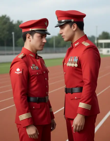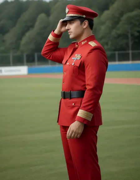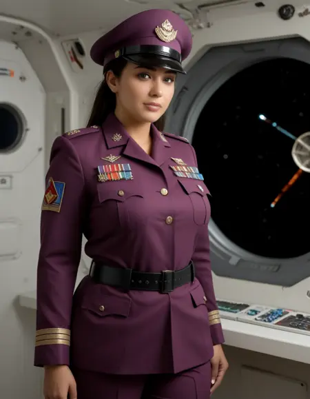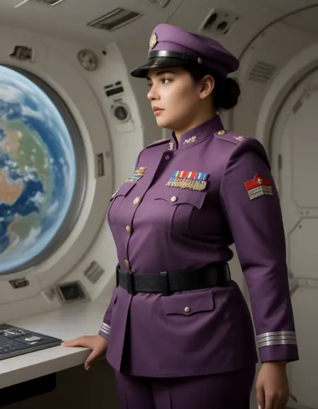 フル袖とハーフ袖、ベルト、パイプ帽を備えた司令官制服スタイル。前面、側面、背面のビュー。男性にも女性にも対応。6エポック学習したが、エポック2を選択。6エポック目は過学習しているように見え、他のキャラクターの顔の特徴が失われている。