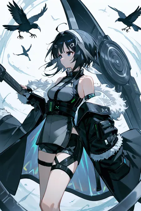 原皮:la pluma (arknights),1girl,scythe,solo,black hair,fur trim,holding,short hair,shorts,holding scythe,gloves,black shorts,black eyes,bare shoulders,off shoulder,thigh strap,black coat,fingerless gloves,ahoge,bangs,white hairband,coat,weapon,fur-trimmed coat,sleeveless,black gloves,short shorts,hairband,open clothes,between breasts,fur-trimmed jacket,jacket,holding weapon,long sleeves,fur-trimmed sleeves,open coat,black footwear,hairclip,shirt,hair intakes,black jacket,thighs,hair ornament,amazing quality,ultra hd 32k,