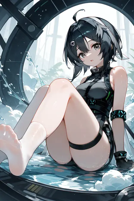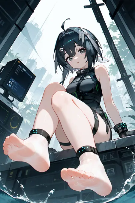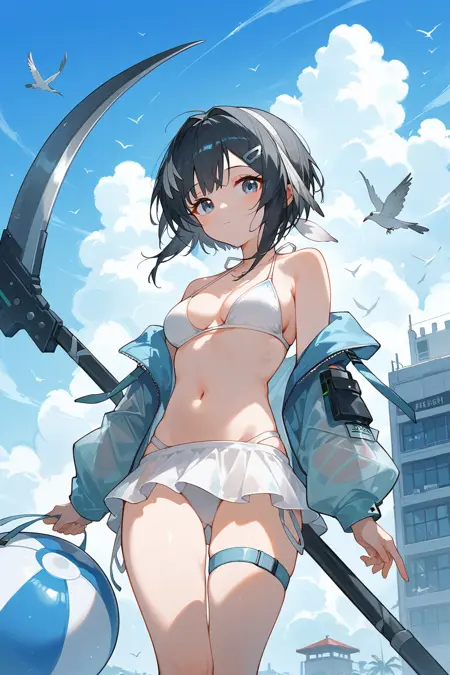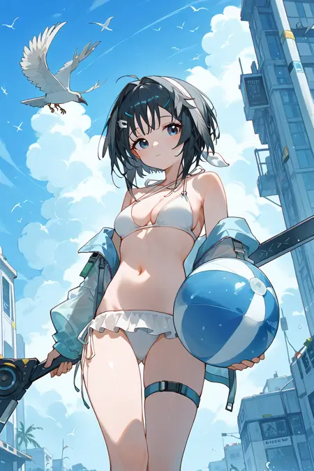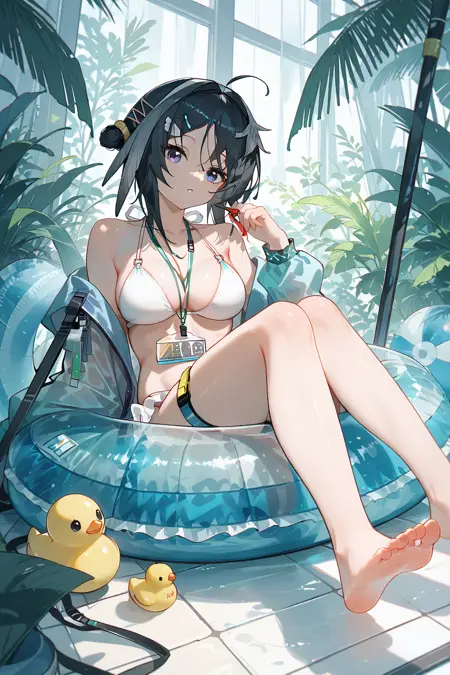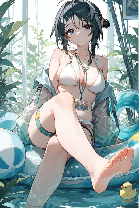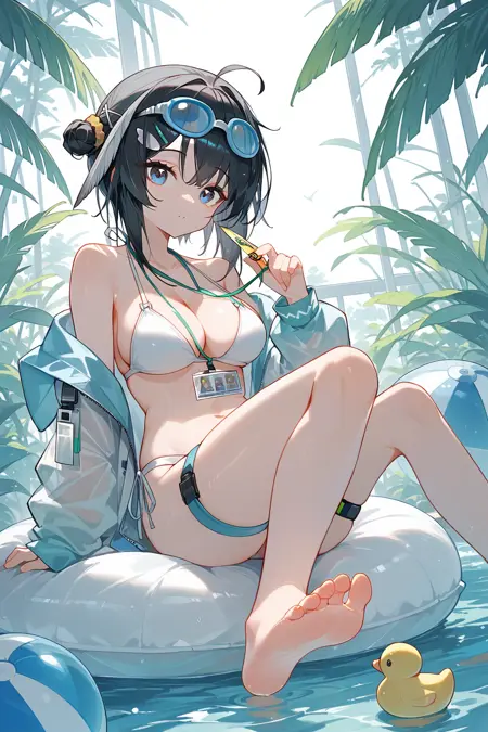 泳装:1girl,solo,swimsuit,official alternate costume,feet,breasts,bikini,barefoot,white bikini,ball,blue eyes,looking at viewer,beachball,jacket,toes,soles,thigh strap,black hair,innertube,off shoulder,open jacket,bare shoulders,cleavage,id card,open clothes,short hair,hair ornament,hairclip,feather hair,bangs,ahoge,thighs,bare legs,parted lips,legs,long sleeves,goggles,lanyard,