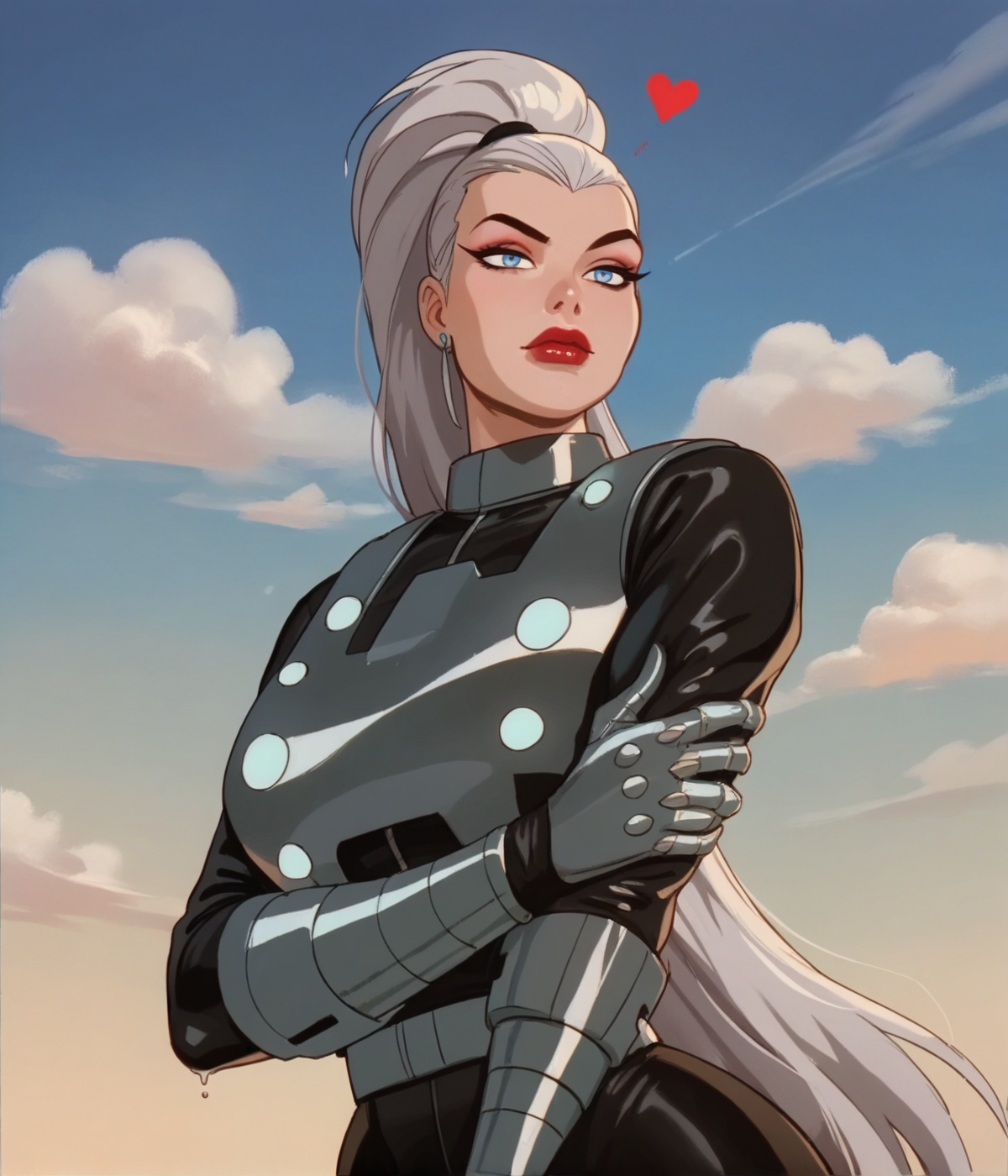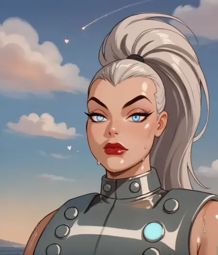 M0l0x, 1girl, solo, long hair, blue eyes, ponytail, sky, cloud, uniform, lips, makeup, parody, lipstick, red lips, retro artstyle, style parody