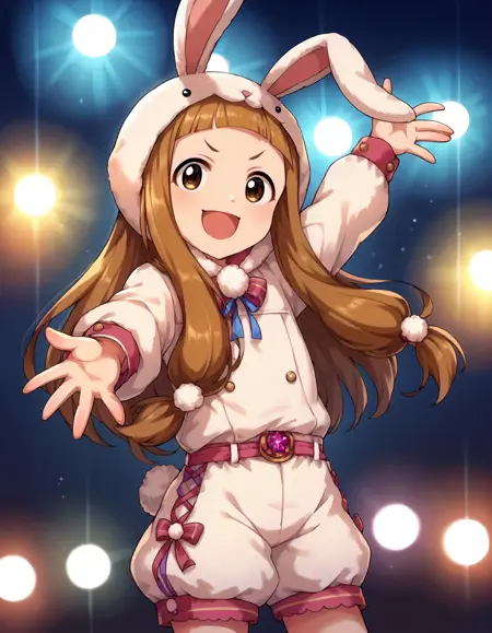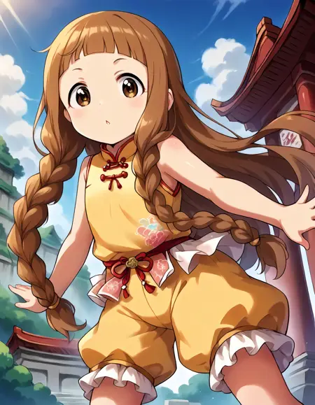 茶色の髪、長い髪、ストレートな前髪、茶色の目、平らな胸
