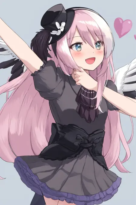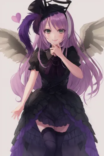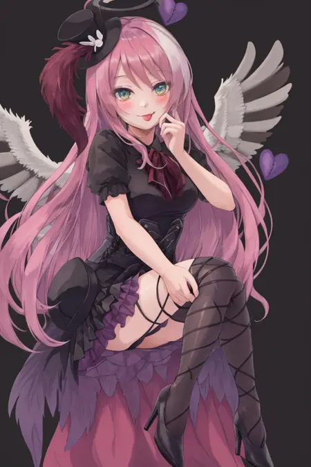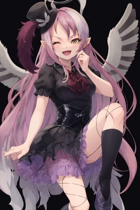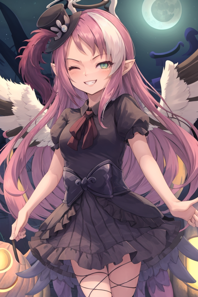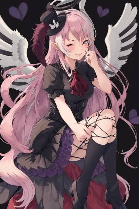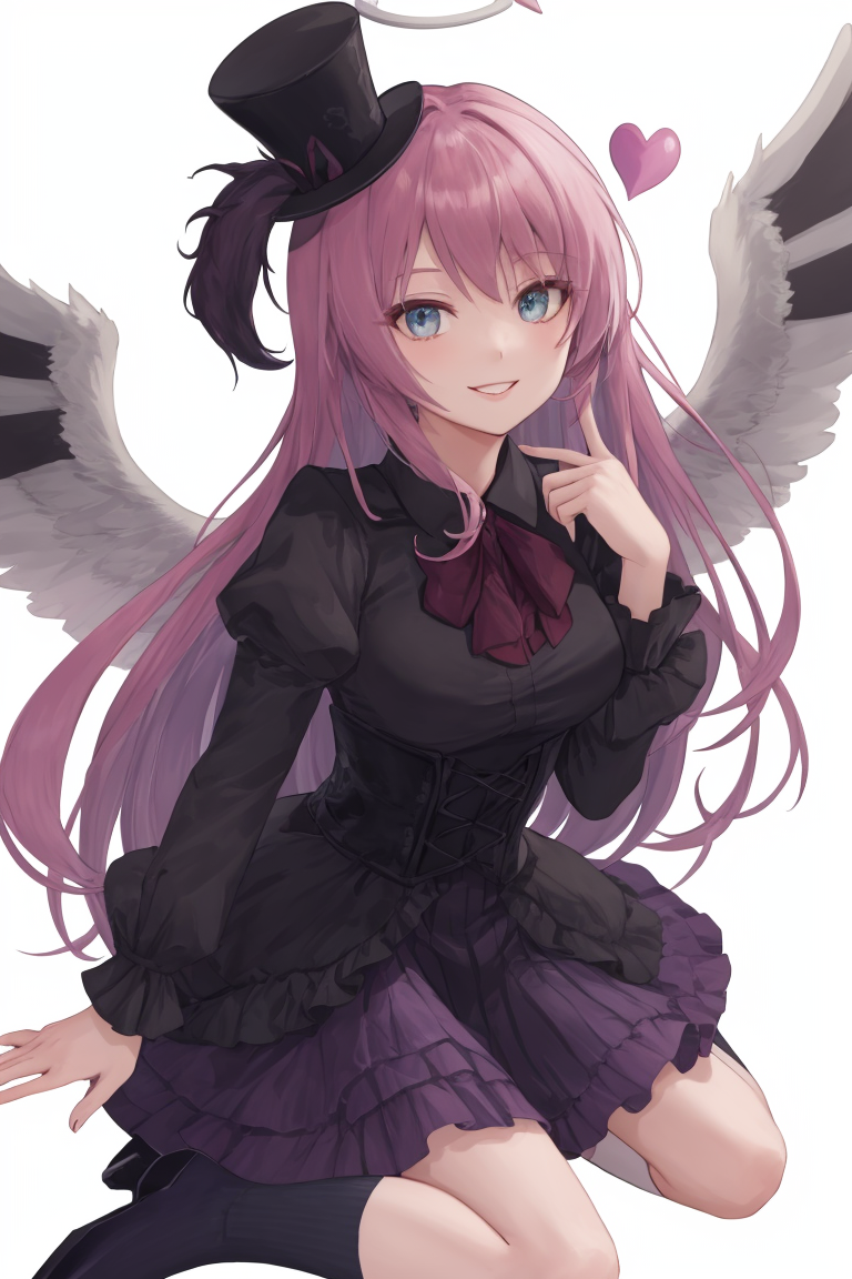 提示词:ghostrickaom,微笑,帽子,裙子,心形,袜子,光环,高顶帽