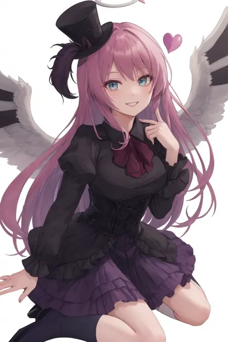 프롬프트: ghostrickaom, smile, hat, dress, heart, socks, halo, top hat